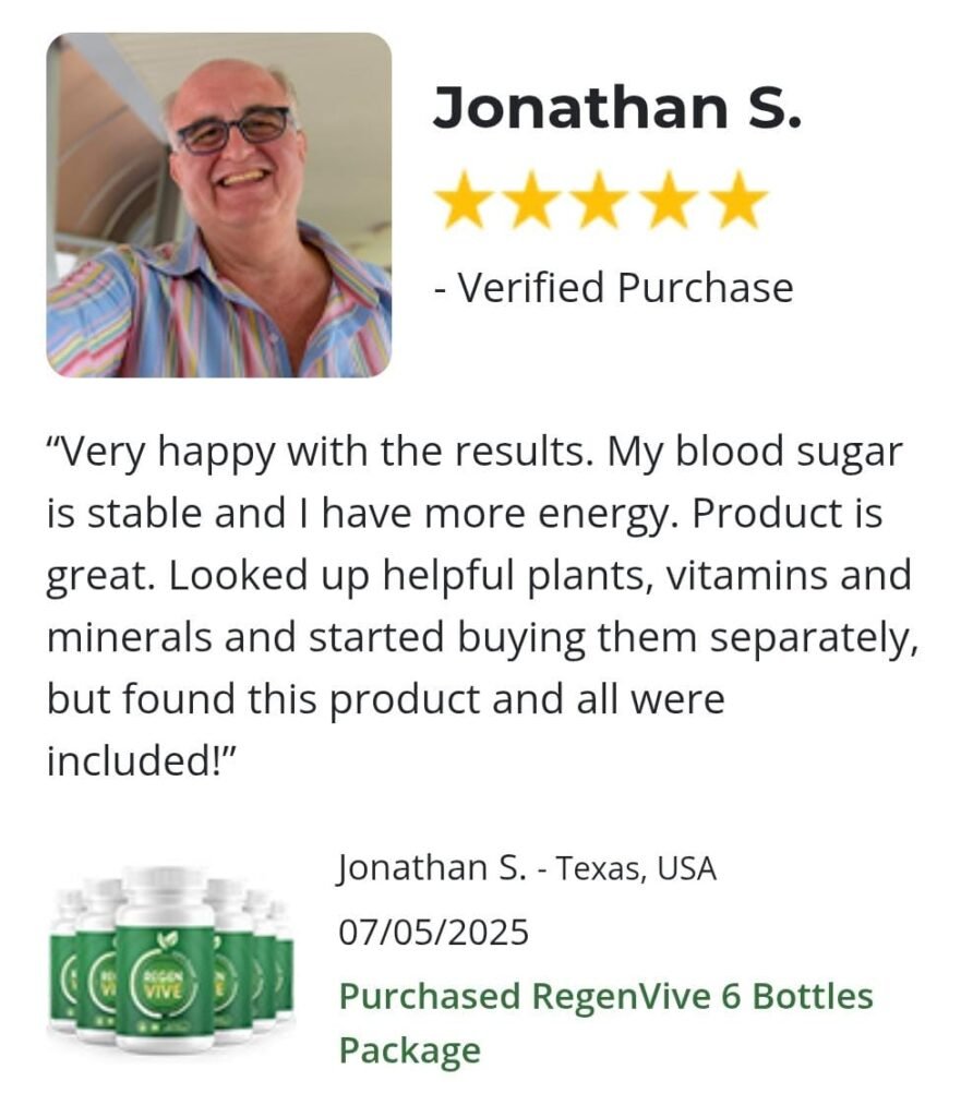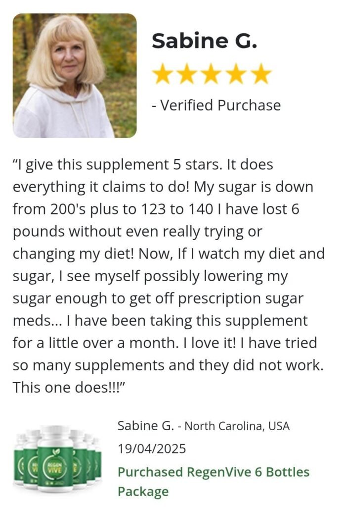 RegenVive is a natural supplement designed to help maintain healthy blood sugar levels, support insulin sensitivity, and enhance metabolic wellness. Its advanced formula uses proven ingredients to promote glucose balance and overall vitality — without drugs or harsh chemicals.